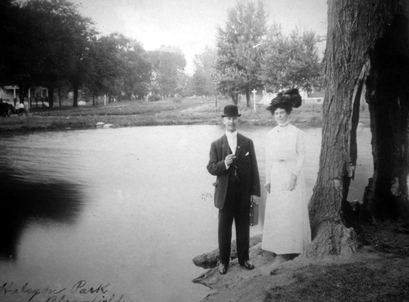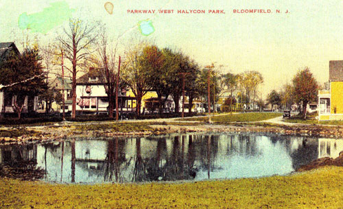 ![]() | This photo is from the Historical Society of Bloomfield's collection. The man and woman are identified as Mr. and Mrs. Friend. The photo appeared in Remembering Essex: a pictorial history of Essex County, New Jersey, by John T. Cunningham (1995) with the following caption: An unidentified couple posed in about 1900, he with derby hat, cigar, and camera, she in white with an elaborate black hat. The tree, seemingly held up only by its bark, and the little pond to their right, were well-known in Halcyon Park, a Bloomfield real estate development that promised buyers "the life of a millionaire" at a low price. Courtesy Bloomfield Public Library. |